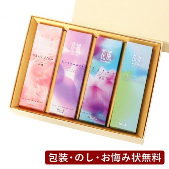 花の香りで人気のお線香「ラベンダー」「白梅」「蓮花」の3種と、芯が水色のろうそくを詰め合せました。色芯ろうそく約50本入り(燃焼時間:約25分)